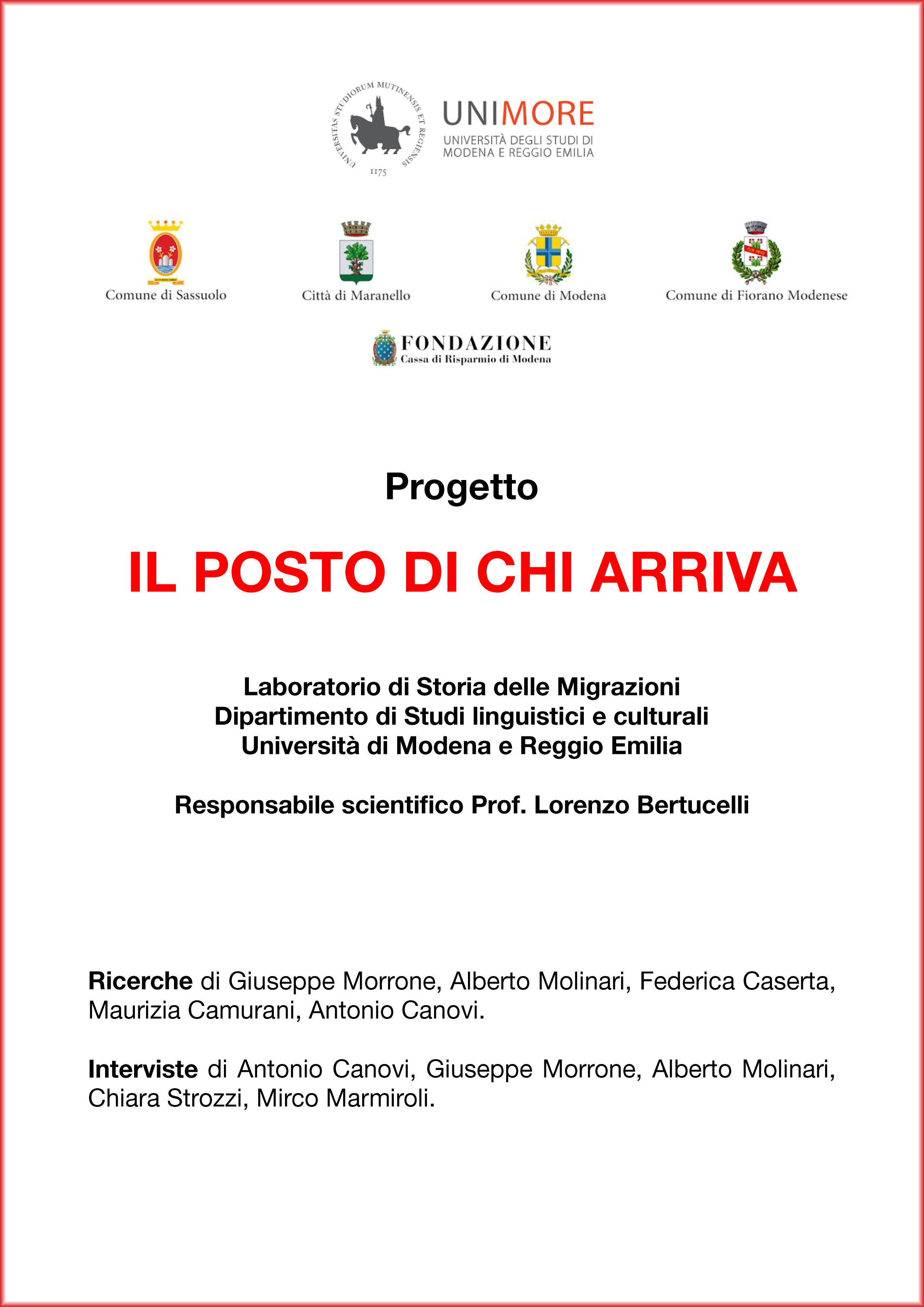 | Paper + video-narrazione "Il posto di chi arriva", Laboratorio di Storia delle Migrazioni (UniMoRe), 2017 Il posto di chi arriva: leredità culturale dellimmigrazione nella biografia storica di Modena e del Distretto ceramico. Esiste una specificità dei flussi migratori da e per Modena città e per il Distretto ceramico, nel contesto della nostra provincia? Quale rapporto sussiste tra gli arrivi provenienti da territori prossimi, come lAppennino, poi da geografie più lontane ma sempre italiane, il Mezzogiorno e le Isole, infine dai Paesi extraeuropei? A quali difficoltà e quali opportunità si è trovato di fronte un immigrato giunto da Catanzaro come da Tangeri? Quali relazioni e tensioni intercorrono tra la persona che migra e il luogo daccoglienza? Cosa è il posto di chi arriva? E quali ripercussioni sullo spazio pubblico? Come questi sono stati attraversati e modificati dalle domande di cittadinanza progressivamente rivendicate da sempre nuovi soggetti migranti (individui o organizzati tra loro)? Quali le risposte fornite dai soggetti collettivi, le soluzioni adottate dalle istituzioni? Sono alcune delle domande su cui si è concentrato il progetto di ricerca Il posto di chi arriva, proposto nel gennaio 2016 dal Laboratorio di Storia delle Migrazioni (afferente al Dipartimento di studi linguistici e culturali dellUniversità degli studi di Modena e Reggio Emilia) con il sostegno fattivo dei Comuni di Sassuolo, Fiorano, Maranello, Modena insieme alla Fondazione Cassa di Risparmio di Modena. I primi esiti di questo progetto in progress sono un report scientifico, una video-narrazione basata su una sintesi delle interviste effettuate a 50 persone migranti e residenti nel nostro territorio, una mostra fotografica.