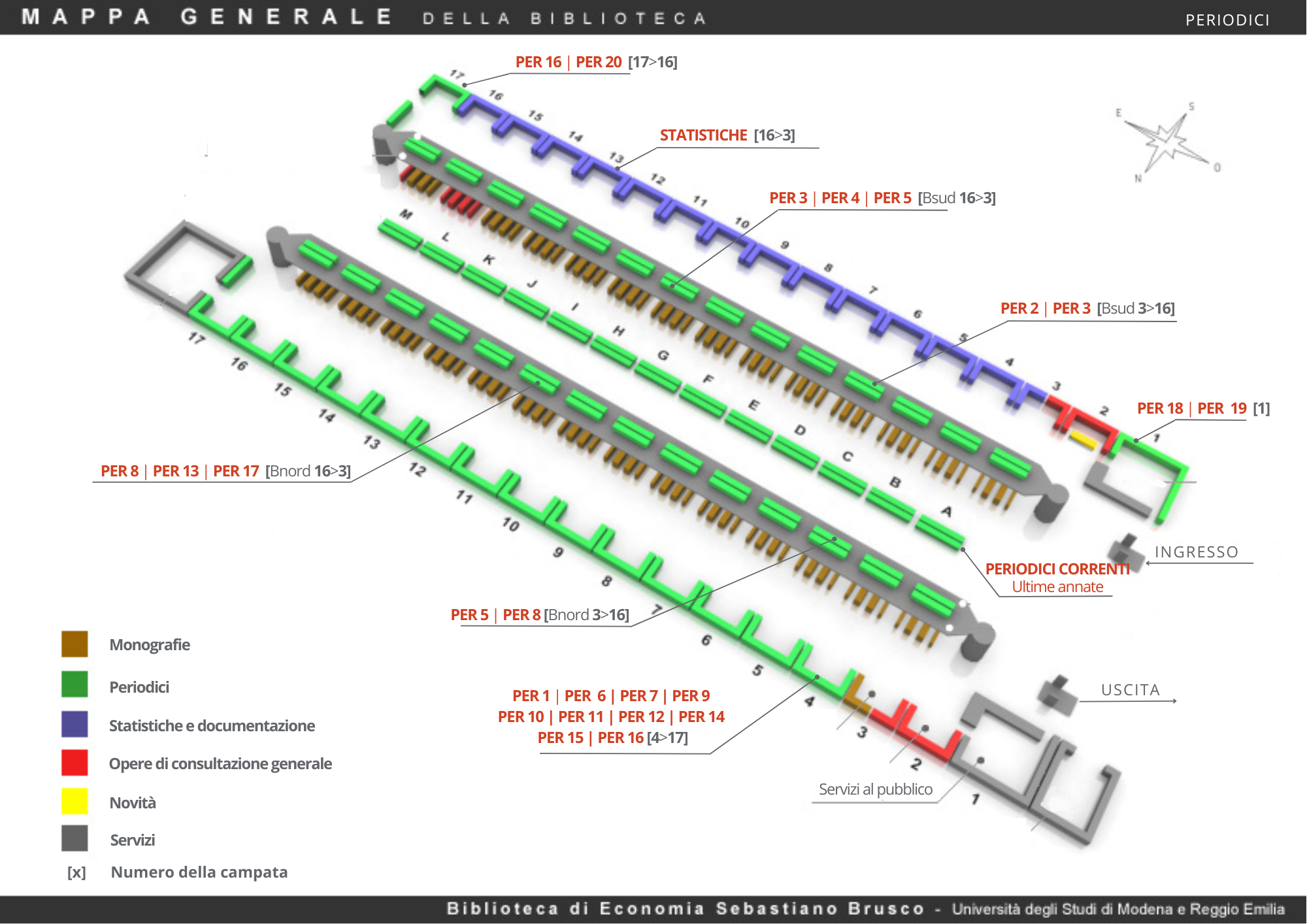 (*) Per esigenze di spazio alcuni periodici sono stati dislocati in posti diversi rispetto a quanto riportato sopra. Guarda di seguito l'indice cliccabile dei periodici "Fuori posto". Clicca sulle collocazioni per visualizzare i dettagli della loro dislocazione.